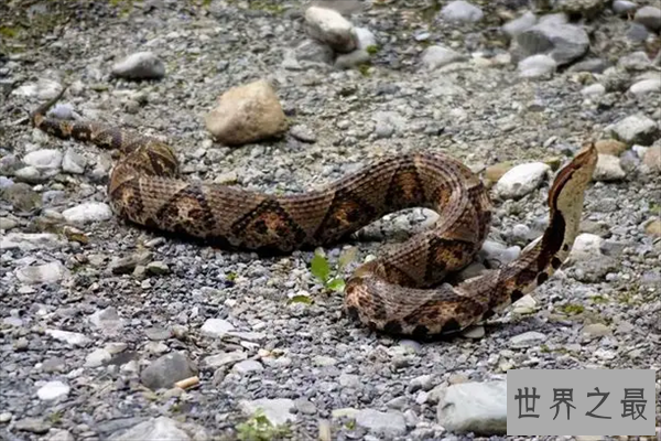 尖吻蝮也叫七步蛇、五步蛇,主要生活在山区或丘陵地区,头部呈三角形,鳞片颜色以棕黑色、土黄色为主,平时注意以老鼠和青蛙为食,它的毒性比较强,在被咬后一百步内一定会毒发身亡,在中国十大毒蛇排行榜中排第二。