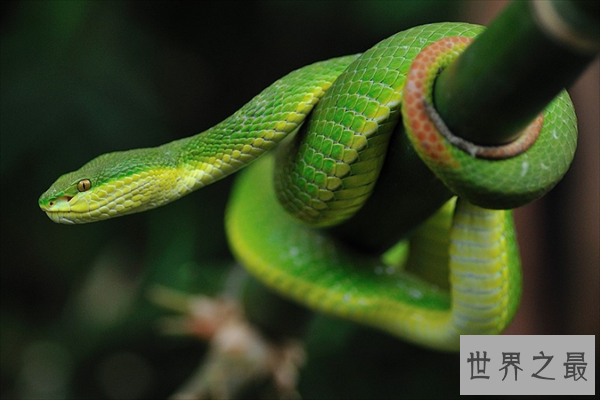 白唇竹叶青也叫竹叶青,脖子细长,头部呈三角形,鳞片以绿色为主,攻击性很强,平时主要以一些老鼠、蜥蜴等小型动物为食。白唇竹叶青的毒性虽然不算很强,但也可能会导致心脏衰竭。