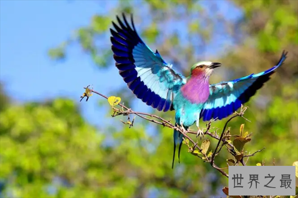 紫胸佛法僧是一种生活在非洲草原地区的鹦鹉,体形不算大,羽毛以蓝色、绿色为主,也是最漂亮的十种鸟之一,平时主要以各种昆虫和一些 小型哺乳动物为食物来源。
