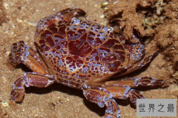 绣花脊熟若蟹也叫雷公蟳,主要生活在珊瑚礁丛中,身体为红白色的花纹覆盖,因体内含有多种不同的毒素,也是目前已知最对的螃蟹,它的毒素最多可以毒死四万多只老鼠。