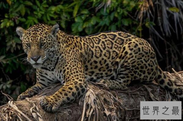 美洲豹是世界上现存的体型第三大的猫科动物,它们的体形像虎,身上的花纹像豹,性情凶猛,以各种小型哺乳动物为食,也是陆地上最厉害十大动物之一。