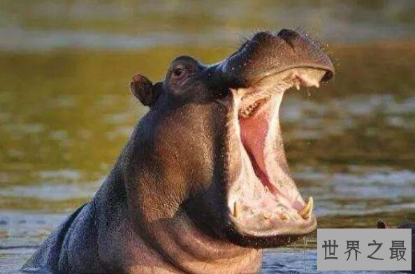河马是世界上咬合力最大的哺乳动物,它们有着巨大无比的的张开可以呈90度角的大嘴,咬合力达到826千克,位列咬合力最大的动物排行榜十名第一名。