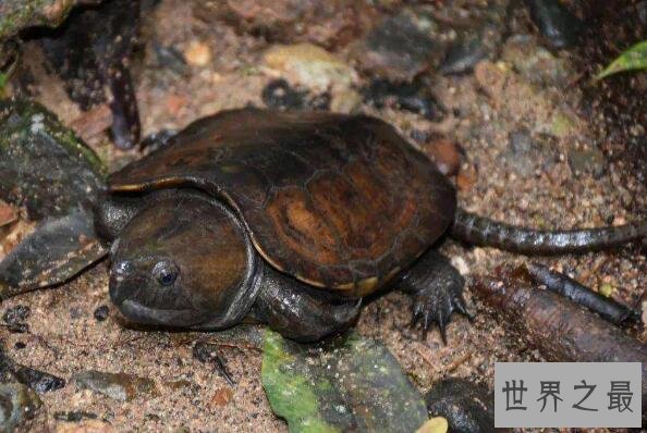 鹰嘴龟也叫平胸龟,因其上、下颚钩曲呈鹰嘴状而得名,鹰嘴龟的尾巴很长,几乎和它们的体长相等,因为数量稀少所以十分名贵,市场上也很少见到。