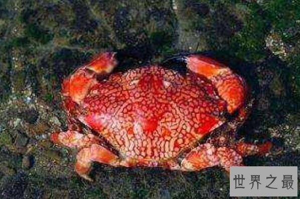 绣花脊熟若蟹也叫马赛克蟹,是生活在海中的一种有毒的螃蟹,它们有着红色的体色,身体上还长满红白相间的网状花纹,但它们却是目前已知的最毒的螃蟹,它们体内含有的毒素能够毒死45000只小老鼠。