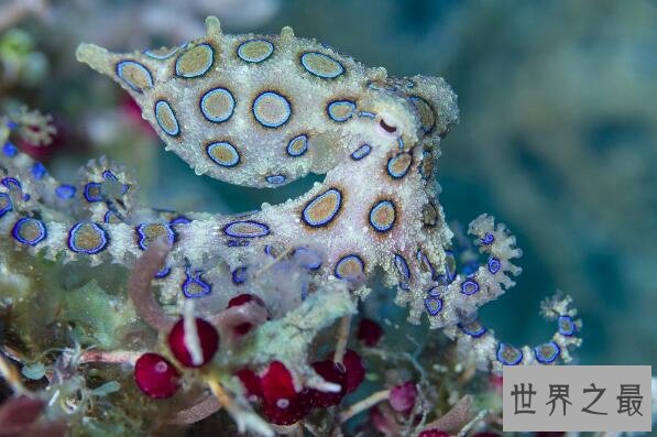蓝环章鱼是主要分布在日本和澳大利亚之间海域的一种体型较小的章鱼,它们有着十分艳丽的体色,同时也含有剧烈的毒素,如果被它们咬上一口就能致人死亡,是海洋有毒的十大杀手之一。