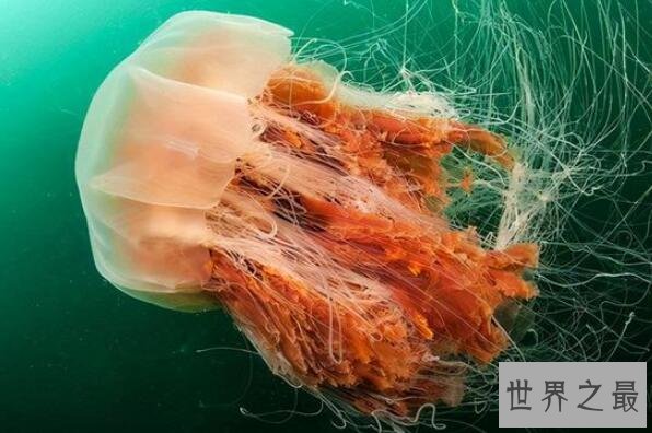 狮鬃水母是世界上体型最大的水母之一,它们主要分布在比较冷的海域,包括北大西洋、北太平洋等,它们的伞形躯体就可以达到2米,最长的触手可达35米,性情非常凶猛。