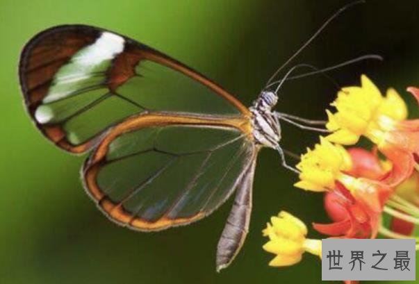 属于蛱蝶科翅膀上大部分为透明只有翅膀边沿有棕色、黑色,通常出现在南美洲,宽纹黑脉绡蝶的飞行速度可以达每小时8千米。别看它的翅膀透明看上去很脆弱,它可以承受比自身重达40倍重量的物体。