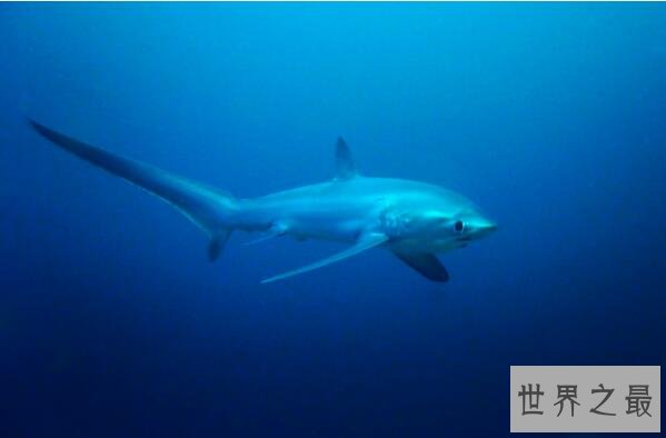 浅海长尾鲨这种鲨鱼的体长平均在3米左右,通常喜欢栖息在公海的水面到150米水深处,而这种鲨鱼因有着比头和躯干长1.5倍多的尾巴,因此通常会用尾巴击昏猎物,来捕食小型群游鱼类和头足类。