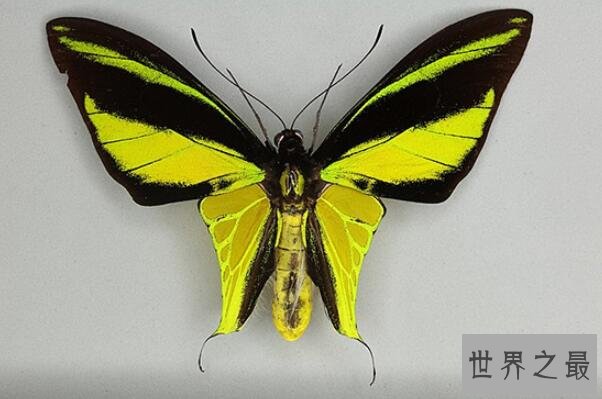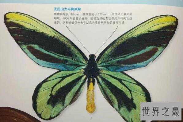 这个世界上最大的蝴蝶于1907年被罗斯柴尔德命名,是为纪念爱德华七世的亚历山大皇后,目前仅在新几内亚东部地区有所发现,因其翅膀反右绿色光泽,并带有异常诱人的花纹和颜色,因此被众多蝴蝶收藏家所喜爱,目前已经成为濒临灭绝物种。