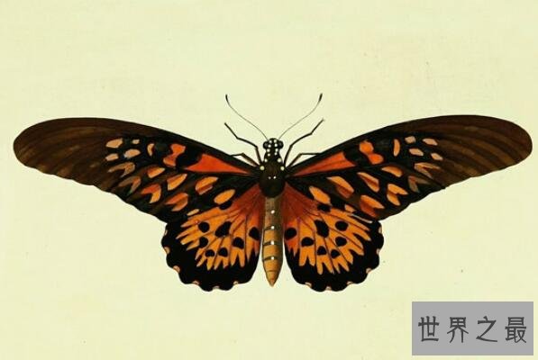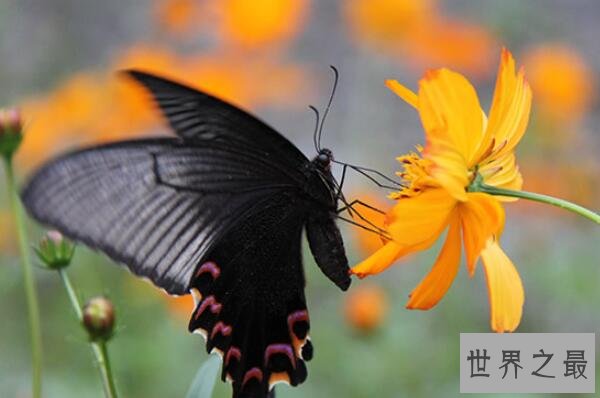 非洲长翅毒凤蝶是一种主要分布在乌干达、安哥拉、扎伊尔等国家,展翅最长可达280毫米的世界上翅膀最大的蝴蝶,通常正面以橘红色为基本底色,上面分布有黑色花纹,虽然整体漂亮但身体却带有剧毒。