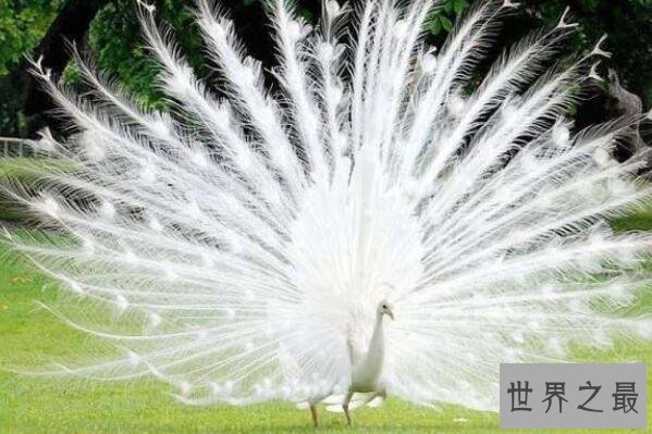 白孔雀是野生蓝孔雀的变异品种,它们全身的羽毛洁白无瑕,没有一点杂色,眼睛是淡红色,数量稀少,极为珍贵,开屏时就像穿着白色的婚纱,给人一种纯洁高贵的感觉。