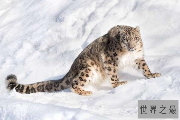 雪豹是一种大型猫科食肉动物,皮毛为灰白色,布满黑色的斑点,常在雪地附近活动,由于非法捕猎等各种因素,雪豹的数量急剧减少,在中国比大熊猫的数量还少。