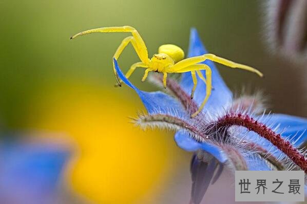 秋麒麟蟹蛛经常以黄色示人,有时也会变成白色,因为它们主要栖息在两种颜色的花朵上,在向日葵上就是黄色,在雏菊上就变化成白色。