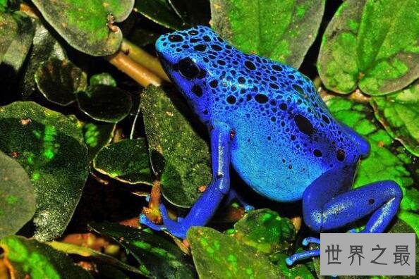 蓝箭毒蛙也叫蓝色毒镖蛙,它们有着深蓝宝石色的皮肤,皮肤上布满黑色斑块,然而它绚丽蓝色皮肤下却藏着致命得毒素,对大部分人和动物都有致命的威胁。