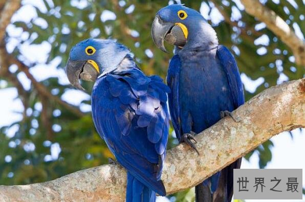 紫蓝金刚鹦鹉是鹦鹉家族中个头最大的成员,体长可达1米,它们长着鲜艳而富有光泽的蓝色羽毛,身价十分昂贵,被人类大量猎捕,已经处于濒危状态。