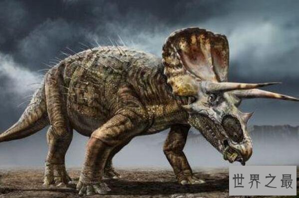 三角恐龙是世界十大最著名恐龙之一,它们相貌凶恶,身体上有一块大型骨质褶边和三个大角,和犀牛有点像,一只大角从鼻子的部位长出,另外两只分别从两只眼睛的上方长出。