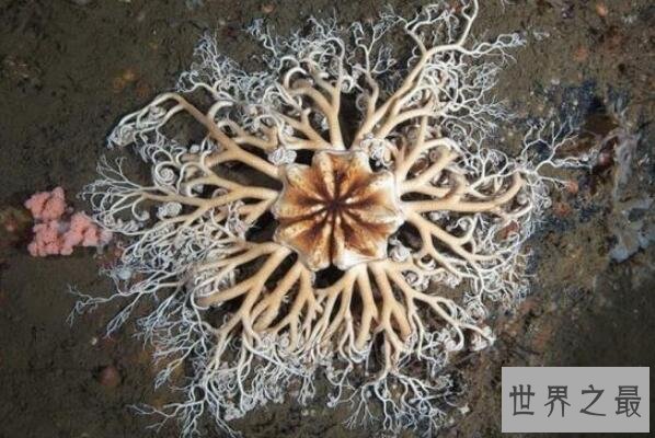 筐蛇尾属于棘皮动物群,长期栖息在深海中,它们的再生能力惊人,5条腕的每一条能分成2条小腕,而这些小腕又再分成许许多多更小的腕足,看上去就像很多蛇盘在一起。