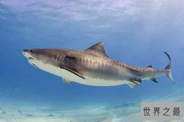 鼬鲨又叫虎鲨,是海洋里凶猛又贪婪的动物,据说在海洋里不管是生物还是人类制造的垃圾都会吞食,而且对人类也有一定攻击性。