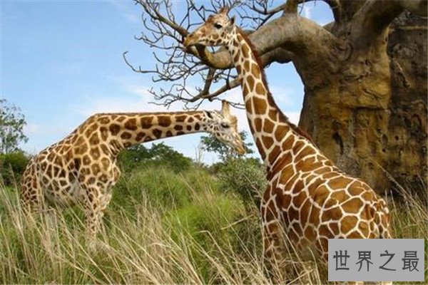 长颈鹿,主要生活在非洲热带,主要特征是超长的脖子,体重在1吨左右,由于长长的脖子,它的形象非常高大,给其他动物一种强烈的压迫感。