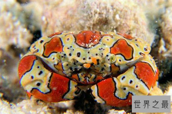 小丑蟹是世界上最小的螃蟹之一,它看起来十分的小巧,能够被拿在手上把玩,外表十分的艳丽,红色斑块和黑色点线交织,常常隐藏在岩石下面。