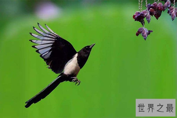 喜鹊是“喜”气的代表,这也是世界上十大最忠贞爱情鸟之一它对于环境的适应能力超强,常常生活中在人类的名居旁,能够和人类友好相处,并且有着清醒的自我意识,有着四岁左右儿童的智商。