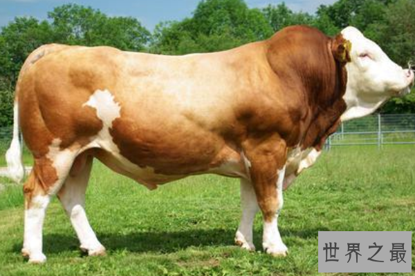 西门塔尔牛的原产地位于瑞士阿尔卑斯地区,它的体型壮大,十分适合用作肉牛。除此之外,它也能作为乳牛喂养,是为数不多肉、乳兼用的重型牛。