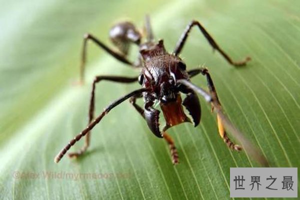 子弹蚁是世界上体型最大的蚂蚁之一 ,它带有极强的攻击性,尾巴上的毒刺更是它的秘密武器,许多大型动物都逃不开,被它叮咬之后会有终身难忘的剧痛感,轻症会几个小时不能动弹,重症会直接死亡。