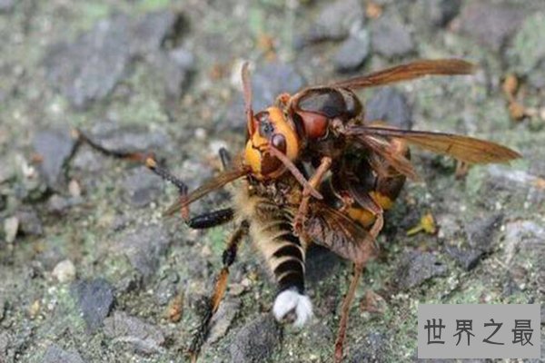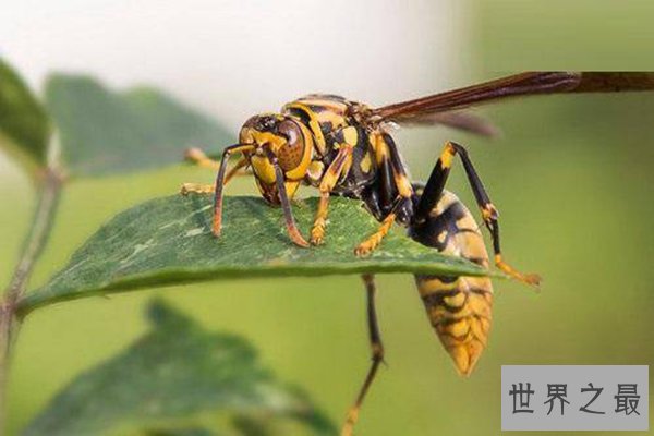 金环胡蜂是世界上体格最大的胡蜂,它是毒性最大的胡蜂,有着极强的攻击性,体内的毒针更是带有剧毒的蜂毒肽,被它攻击后会导致伤口无法愈合,不经过及时治疗的致死率是百分之百,是需要远离的存在。