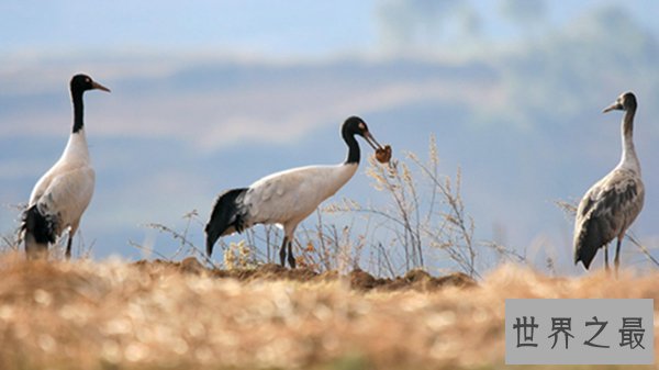 黑颈鹤的头颈部、尾部和脚部都是黑的,身体其他地方覆盖着白毛。这种鸟类夏季喜欢在西藏,后冬季则大都去云贵度过,一直数量都比较少。
