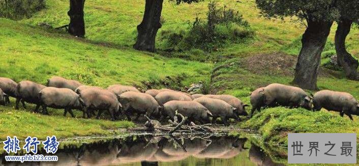 西班牙伊比利亚黑猪一般都在森林里长大,在橡树果林中放养,不仅吃精心调配的绿色饲料,还吃了大量的橡果,所以它们的肉质比一般的更加鲜美,甚至带有橡果的味道,不仅好吃而且健康,西班牙知名火腿原料就是这种黑猪,因为猪肉价格比较昂贵,所以火腿也是比较不菲的。