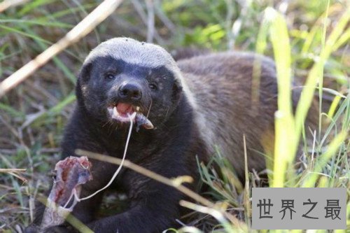 蜜獾是鼬科蜜獾属下唯一一种动物,厚密粗糙的皮毛可以抵御攻击,生性凶猛,既不怕蜂蜇,也不会怕蛇咬,因此它特别喜欢吃蜂蜜,另外也很喜欢吃蛇,一看到蛇他们就会主动进攻,眼镜王蛇、曼巴蛇这样的剧毒蛇类都是他们的食物。