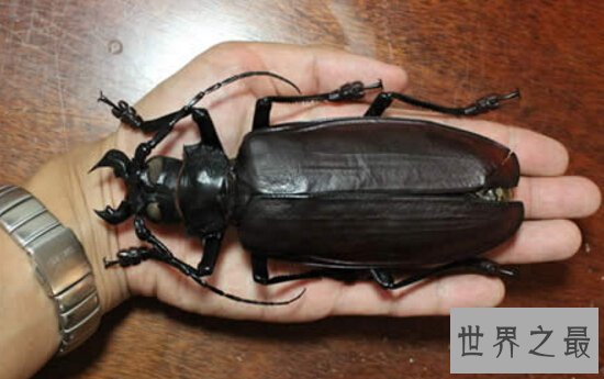 世界上最大的昆虫,泰坦甲虫的成虫身体可以达到6.5英寸(约16.7厘米)长,如果包括其触角长度的话,可以达到8英寸(约21厘米)长,所以被称为世界上最大的昆虫。甲虫是鞘翅目昆虫的统称,属有翅亚纲、全变态类。泰坦甲虫拥有坚硬的外骨骼和强有力的下颚,据说它的下颚可以咬断一根铅笔,或是切入人类的皮肤。成年的泰坦甲虫从不进食,它们只是到处飞来飞去寻找配偶。像许多甲虫一样,泰坦甲虫在受到威胁时会发出响亮的嘶嘶声,恐吓敌人。