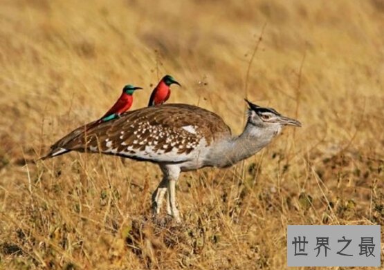 世界上最大的飞鸟颈鹭鸨属于杂食动物,习惯居住在地面,尤其是草地上,成小群活动。灰颈鹭鸨为少数能够吃下老树皮和枯枝败叶的鸟类。所以,它的胃十分强壮,里面可以容纳4~4.5公斤草料,而且灰颈鹭鸨的胃里有大量的细菌,它储存胃中4公斤多的草料会在这些细菌的帮助下进行慢慢的发酵和腐烂,完全需要消化则需要一个月左右。