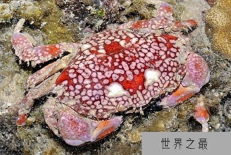 绣花脊熟若蟹又叫做马赛克蟹,这种蟹的甲壳呈椭圆形,表面光滑,全身具红白相间,带有网状花纹,其体内有着剧毒的河豚毒素、麻痹性贝毒、海葵毒等,危害极大。