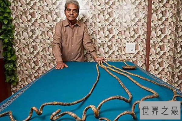 印度人浦那拥有世界上最长的指甲,他的指甲已经有60多年没有剪过了,经过测量他的指甲有909.6厘米长。指甲太长会对他的日常生活造成巨大的困扰,在坚持了那么多年之后,他决定剪掉他的指甲,并在里普利的展览上展出。