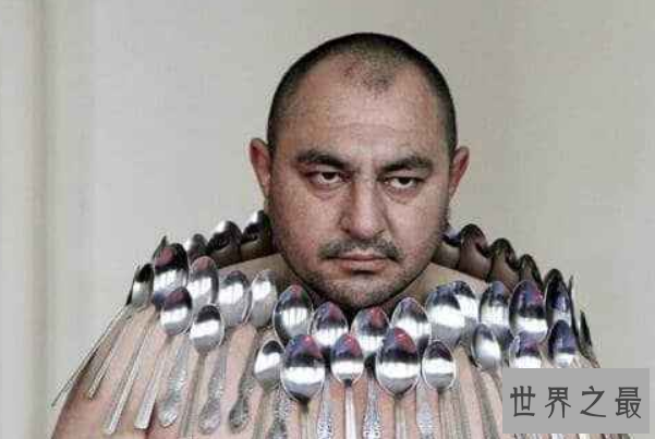 在格鲁吉亚第比利斯的艾尔奇耶夫在他的身体上一共吸附了50把勺子,获得了是界吉尼斯纪录。