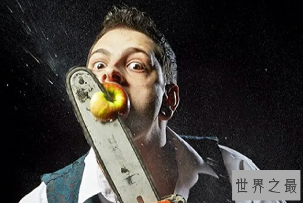 这项吉尼斯世界纪录是由英国的约翰尼斯特兰奇在一分钟内用链锯割掉了放在嘴里的8个苹果,无人超越。
