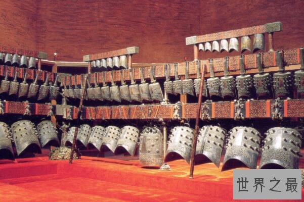 曾侯乙编钟整体架长748厘米,高265厘米,全套共有六十五件编钟的战国曾国国君大型礼乐重器,于1978年在湖北随州出土,目前收藏于湖北省博物馆中的国家一级文物,全套钟齐备十二个半音,可演奏五声、六声或七声音阶乐曲,并对考古、音乐、历史等多个领域有着重大影响。