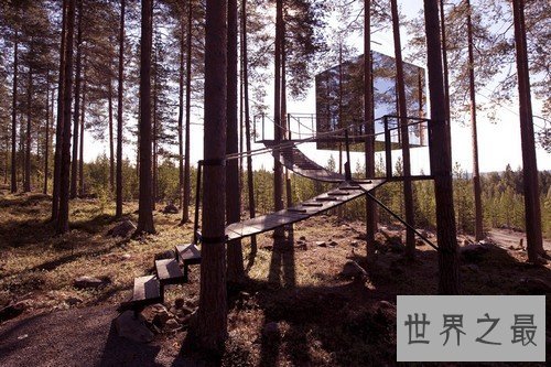 Mirrorcube位于瑞典哈达斯,毫无疑问这是全世界最奇特的酒店。这个酒店的房子都是4X4X4米铝箱,缠绕在一个树干上。住在里面可以看到更多的风景,这间客房设有一张双人床,可供2人入住,还设有起居室,浴室和屋顶露台,旅客可以使用绳索桥进入酒店。