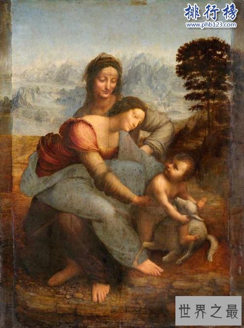 在这幅1503年左右完成的绘画中,列奥纳多描绘了圣安妮,她的女儿圣母玛利亚和婴儿耶稣,他们正在与一只牺牲的羊羔挣扎。动态的构图清楚地表明玛丽向耶稣的婴儿伸出手。同时她坐在圣安妮的大腿上,把三个人物连在一起。与“岩石圣母”中使用的技术类似,莱昂纳多在一个梦幻般的景观设置宗教场景。多山的背景表达了他对地质学的兴趣,并且是他大部分作品中反复出现的主题。