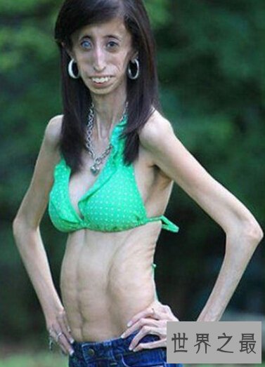 另外,世界上最丑的女人——丽兹.维拉斯奎兹(LizzieVelasquez)一天要吃60顿饭,每隔15分钟就要吃一餐,但体重只有25公斤,曾经为世界上最瘦的女人,后这一记录被俄罗斯女孩打破。世界上最丑的女人——丽兹.维拉斯奎兹的体重和8岁女童差不多,体脂肪几近零。丽兹.维拉斯奎兹并非厌食症,她的罕见症状全球只有三例。身高1.57米的丽兹每天进食60次,每天消耗5000到8000卡路里,就是长不胖。她说:“我常称体重,只要能增加1磅,就很兴奋。”