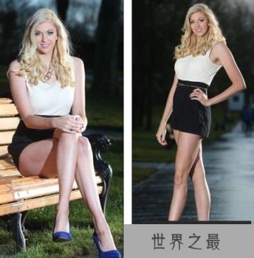 20岁的英国模特亚历山大·罗伯逊一双长腿有1.19米,她表示,平常只要穿上高跟鞋外出,往往会吸引不少人的眼球。自己这对长腿虽然引人注意,但是往往也让她难以买到合适的衣物,还会“吓”到部分男士。