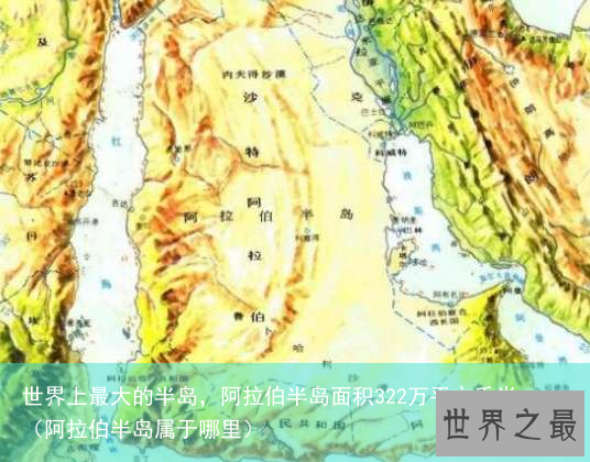世界上最大的半岛阿拉伯半岛南北长2240千米,东西宽1200~1900千米,面积322万平方千米,海拔1200~2500米。是古老平坦台地式高原,地势自西南向东北倾斜。除西南端海拔2700~3200米的也门高地外,仅在西南和东南部有小部分山地。