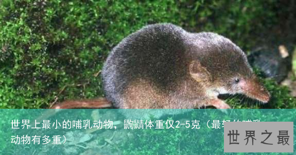 世界上最小的哺乳动物是鼩鼱,它的体长仅4-6厘米,尾长4-5厘米,体重2-5克,鼩鼱等食虫类的被毛比较柔软细密,吻鼻延伸成灵活的吻突,具有五趾型。但是鼩鼱的食量非常大,一天到晚总是吃,每天至少得吞进同自己体重一样重的食物。