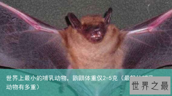 大黄蜂蝙蝠,也被称为基蒂的猪鼻蝙蝠,是世界上最小的蝙蝠种类,也是世界上头骨尺寸最小的哺乳动物。重量只有2克左右,身长为1-3英寸,比世界上最小的哺乳动物大一点。它们的数量却稀少,生活在缅甸一些洞穴的大黄蜂蝙蝠不到一百只