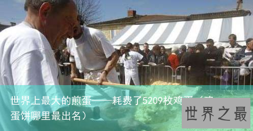 当地时间2009年4月13日,法国西南Haux,世界上最大的煎蛋耗费了5209枚鸡蛋,20升油,50公斤熏肉,50公斤洋葱和大蒜,2公斤盐和2公斤胡椒粉,大煎蛋提供给复活节后的星期一的700名市民享用,每年这时候Haux的人们都会多添加一个鸡蛋反复打破此项世界纪录。