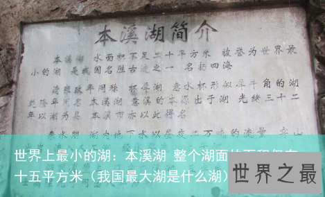 本溪湖位于中国辽宁省本溪市溪湖区溪湖西路的一个大堡卧云山崖之下,是一个洞中湖,整个湖面的面积仅有十五平方米,本溪湖已经成功获得吉尼斯世界记录,成为了世界上最小的湖。