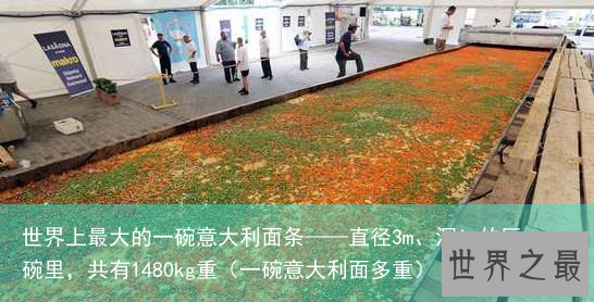 2002年8月22日中午,世界上最大的一碗意大利面条在旧金山出锅。面条和着香喷喷的肉末番茄酱,盛在直径三米、深一米的巨碗里,共有一千四百八十公斤重。这创下了新的吉尼斯世界纪录。