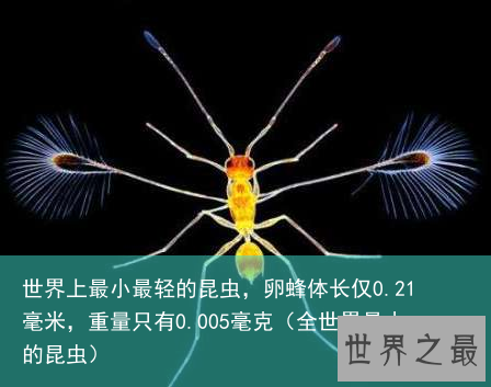世界上最小的昆虫 “毛翼”甲虫和棒状翼的“仙女蝇”(一种寄生黄蜂)是人们所知道的最小的昆虫。 这两种昆虫甚至比某些单细胞原生动物还要小。 据测算,没吃饱的单个的雄性吸血虱和寄生蜂的体重仅0.005毫克,而每颗寄生蜂的卵就更小了,它的重量只有0.0002毫克, 超出常人想象。