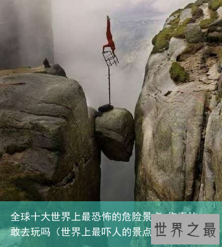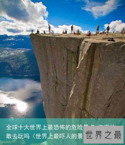 最是惊险最近有报道说中国张家界天门山鬼谷栈道掉下了头石砸伤了人,看来出去旅游,有些景点虽然好看,刺激,还是要注意下安全啊,今天给大家带来的就是全球十大世界上最恐怖的危险景点,你真的敢去玩吗?这个世界上真的是无奇不有,有无与伦比美丽的风景,也有让人吓破胆的地方,爱挑战爱冒险的人一定不会错过这些刺激的地方,但如果是胆小或是有惧高症的人到了这些恐怖的地方,可能连一步都不敢靠近,应该说连去都不会去了吧!▼1.挪威布道台(Preikestolen)。